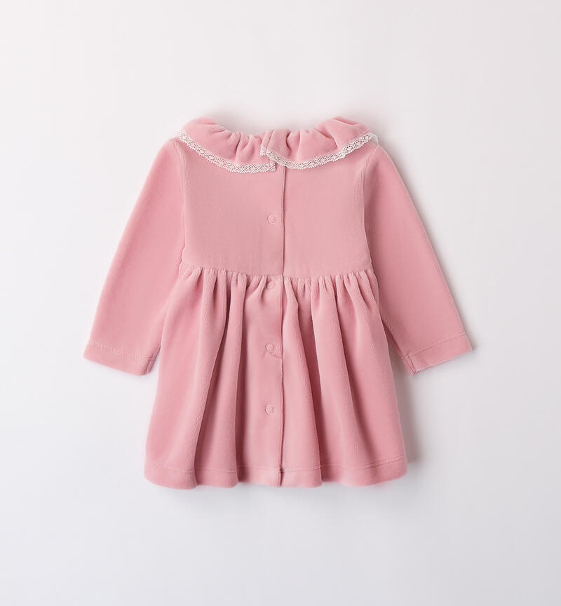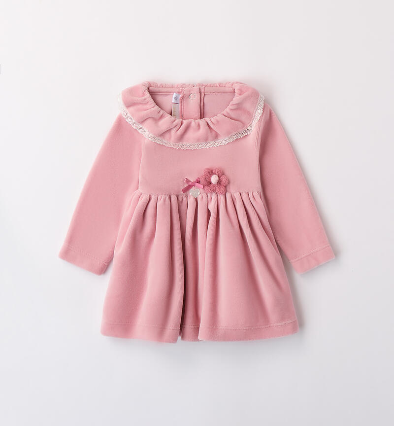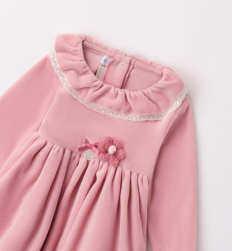 Abito ciniglia bimba Minibanda da 1 a 24 mesi. L’abito è realizzato in ciniglia e presenta apertura sul retro con bottoni a pressione per agevolare il cambio e la vestizione. Modello con colletto con ruches e fiori in vita. Lunghezza mini.