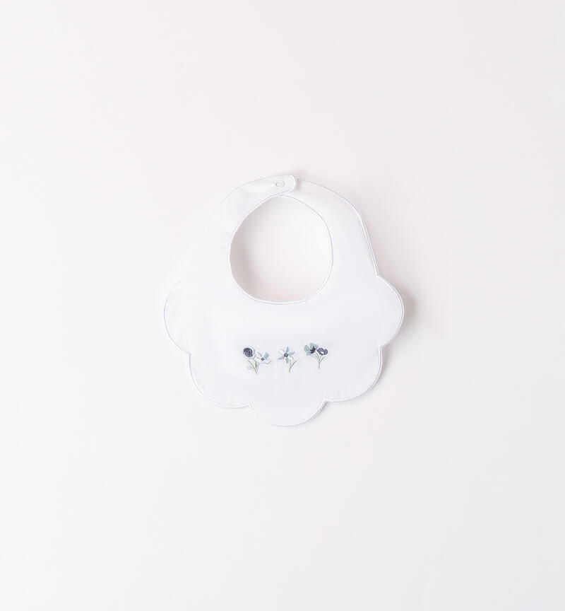 Bavetta neonata Minibanda realizzato in popeline 100% cotone, apertura con bottone a pressione e fiorellini in arricchimento. Il bavaglio è confezionato in un grazioso sacchetto in organza.