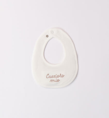 Bavetta neonato iDO realizzata in interlock 100% cotone e apertura con bottone a pressione. Ricamo scritta.