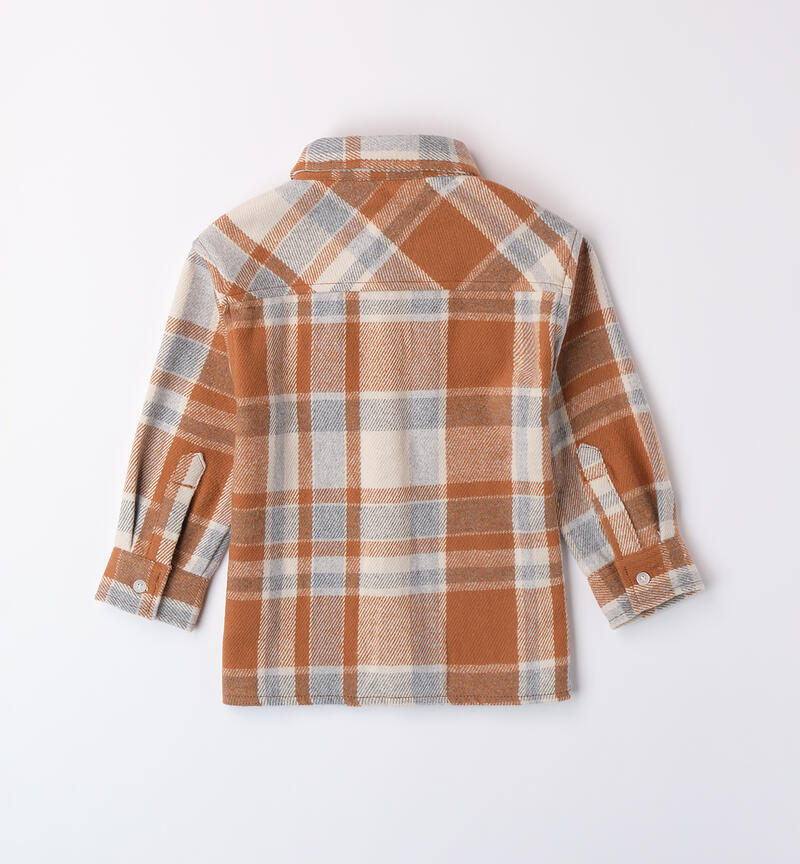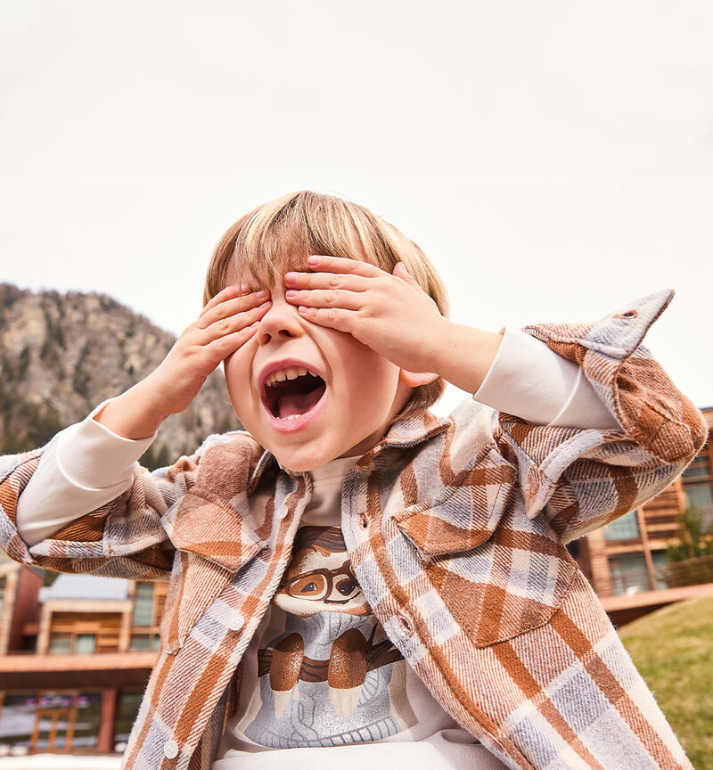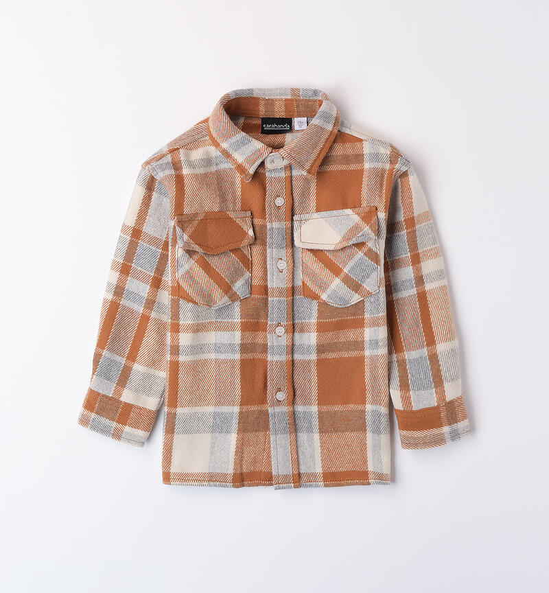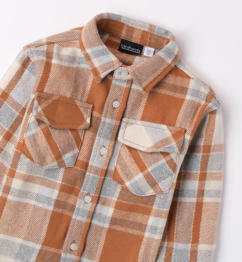 Camicia per bambino Sarabanda in tessuto check. Il modello presenta apertura frontale con bottoni, tasche laterali e fantasia a quadri. Colletto classico.