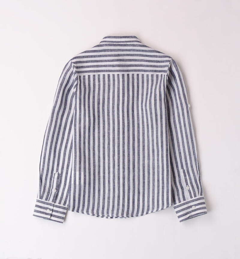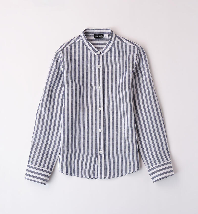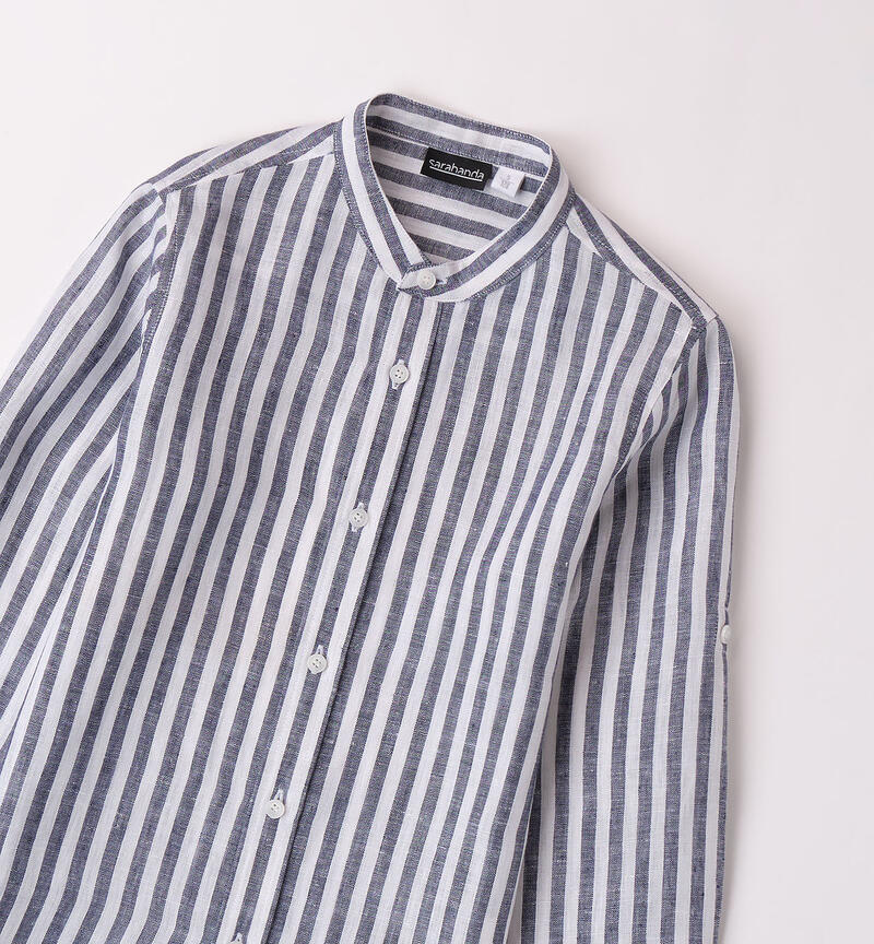 Camicia per ragazzo Sarabanda realizzata in 100% lino. Il modello presenta apertura con bottoni e bottone esterno sulla manica per la realizzazione della manica corta. La camicia รจ realizzata in fantasia a righe.