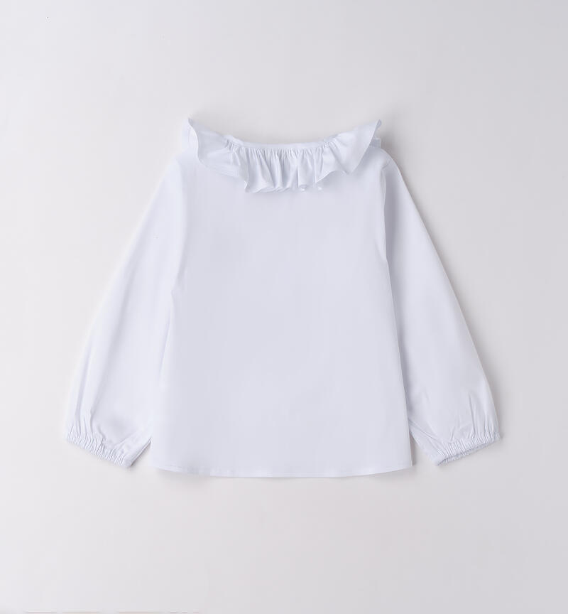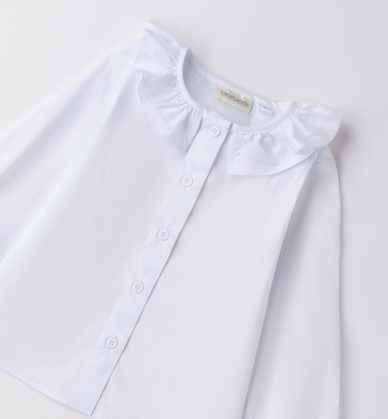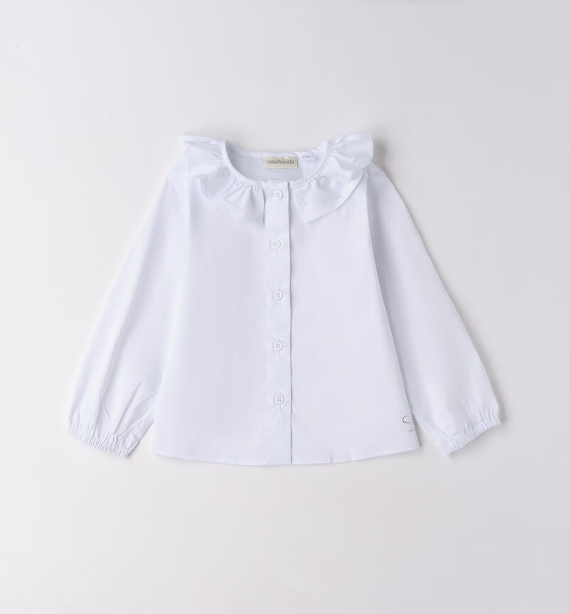 Camicia per bambina Sarabanda in popeline. Il modello presenta apertura frontale con bottoni, colletto a corolla. Elastico sul fondo manica