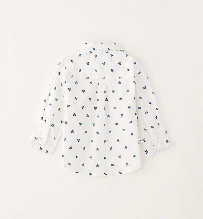 Camicia a manica lunga per neonato Minibanda realizzata in popeline stretch di cotone con fantasia all over di orsetti. Modello classico con apertura tramite bottoni.