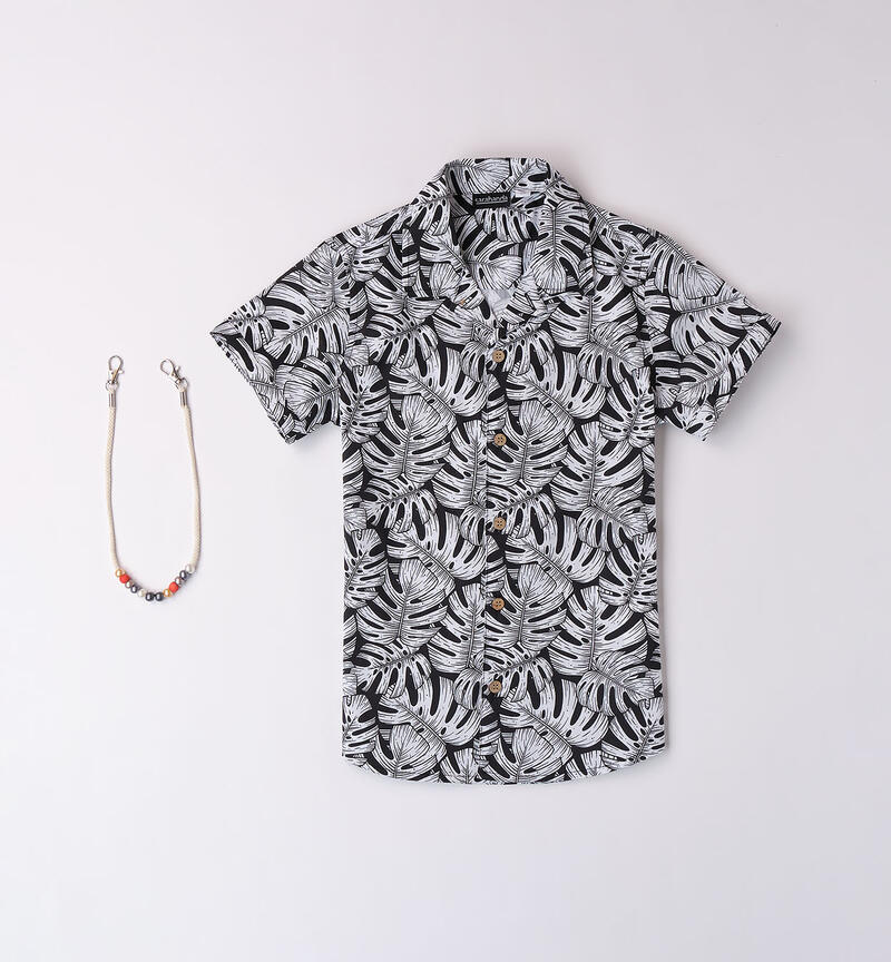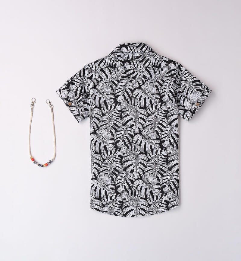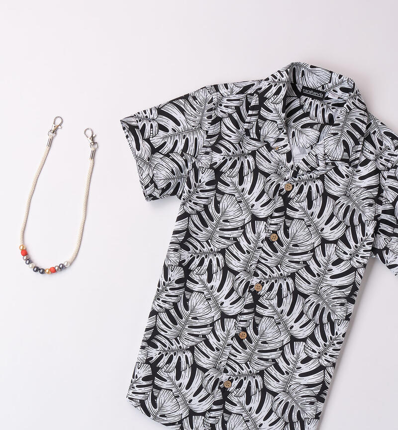 Camicia avvitata per ragazzo Sarabanda realizzata in popeline stretch di cotone. Il modello presenta apertura frontale con bottoni, maniche corte e fantasia allover di foglie. Collana in abbinamento