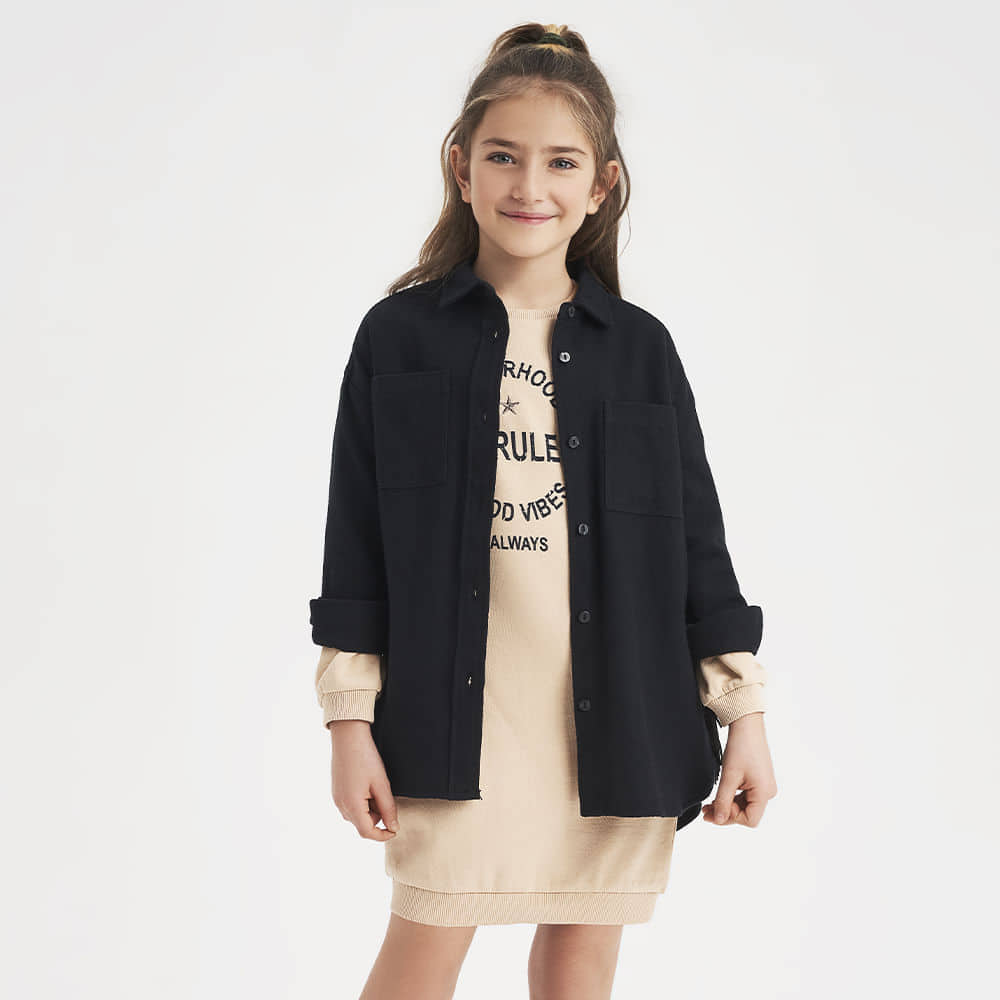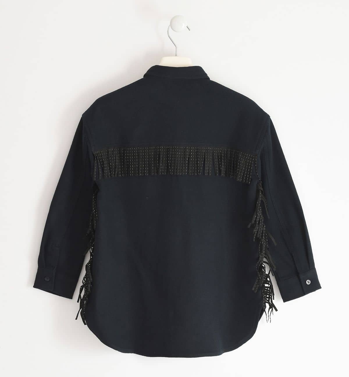 Camicia ragazza iDO realizzata in twill pesante mano pesca con sfrangiatura laterale e sulla schiena. Tasche davanti e apertura con bottoni