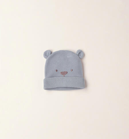 Cappellino iDO per neonato realizzato in morbido tricot 100% cotone con dolce ricamo davanti e applicazione orecchie. Risvoltino sul fondo. Il cappellino รจ confezionato in un grazioso sacchetto in organza.