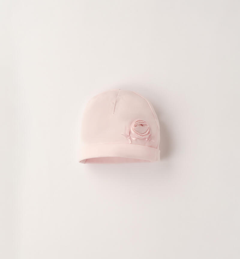 Berretto per neonata Minibanda realizzato in jersey stretch di cotone con risvoltino sul fondo e fiore in applicazione con piccoli fiocchi