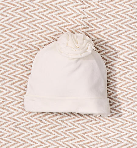 Cappellino per neonata iDO realizzato in jersey stretch di cotone. Il modello presenta fantasia tinta unita con fiore in applicazione. Modello cuffia. Venduto confezionato in apposito sacchetto di organza.