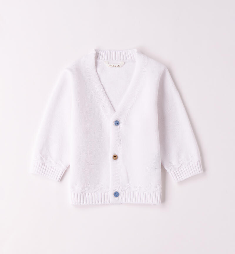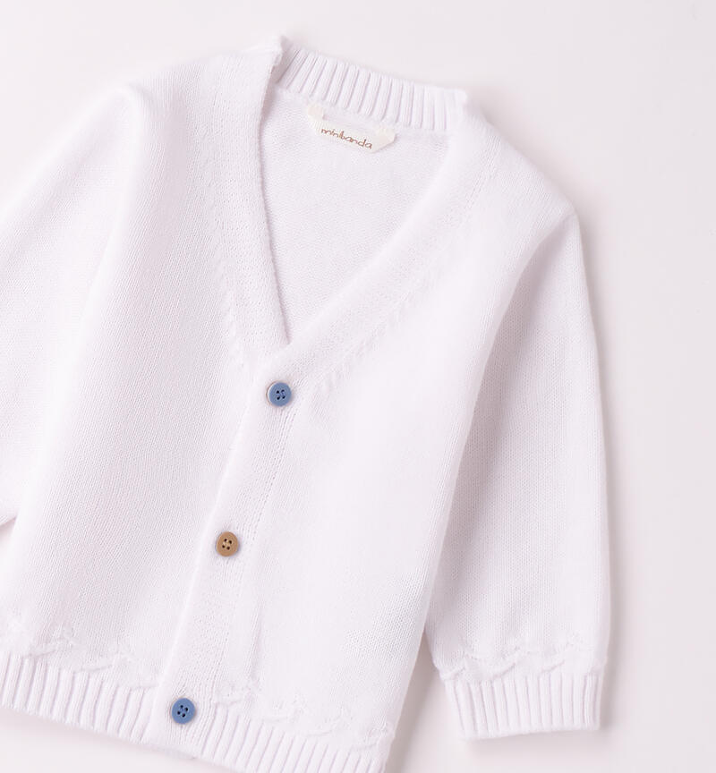 Cardigan per bimbo Minibanda 1-24 mesi realizzato in 100% cotone. Il modello presenta apertura frontale con bottoni ed è in fantasia tinta unita con polsini sul fondo e sulle maniche