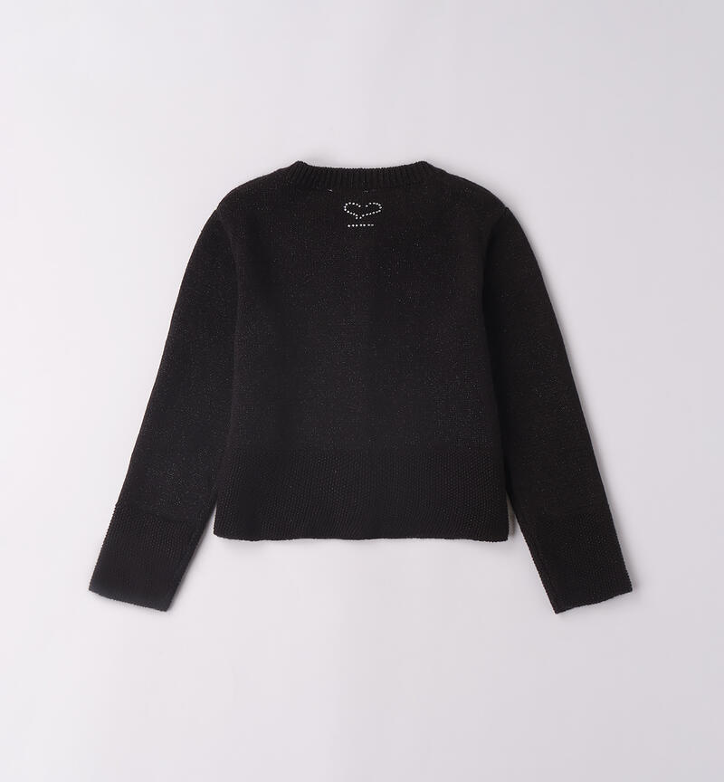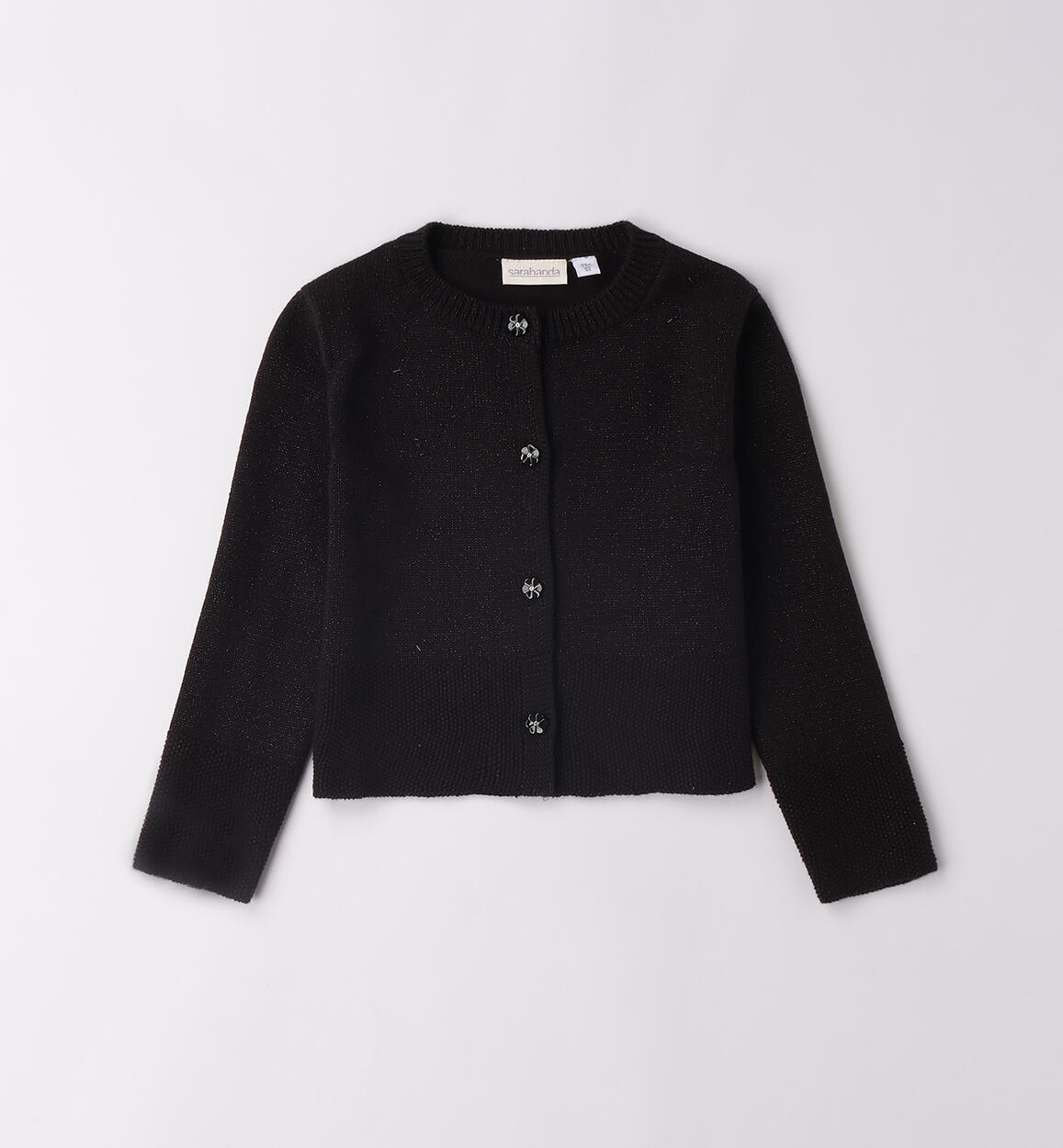Cardigan per bambina Sarabanda realizzato in tricot con lurex. apertura davanti con bottoni arricchiti da strass. Fondo con particolare lavorazione effetto maglia rovesciata