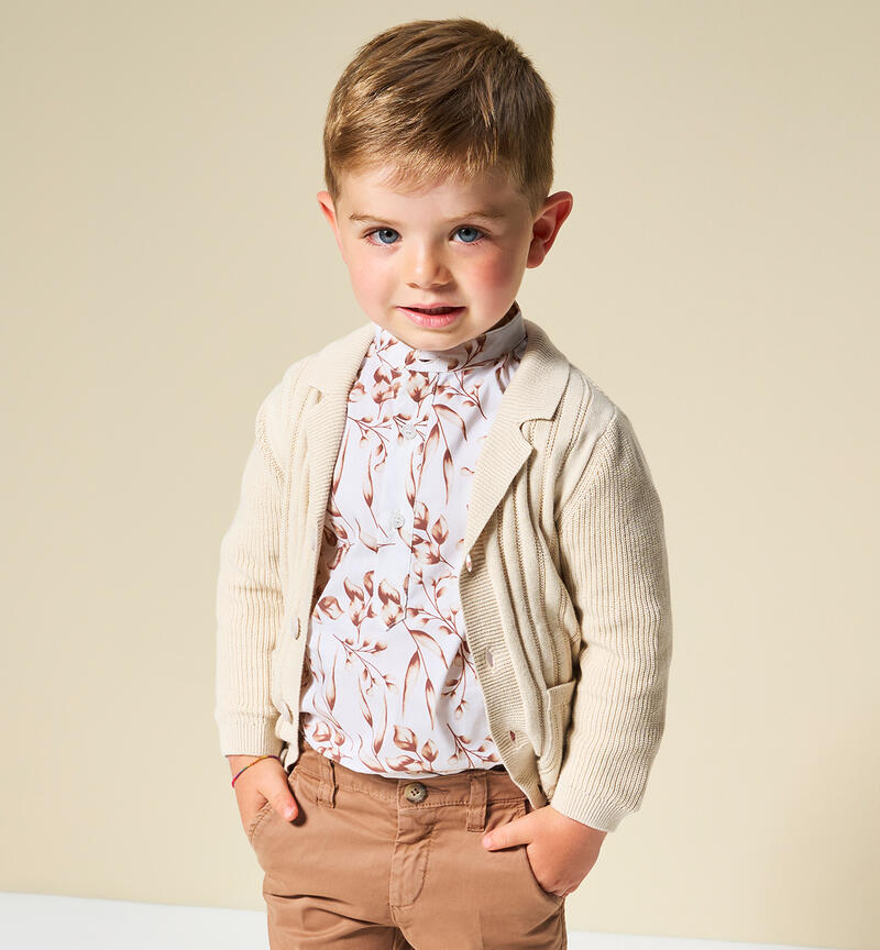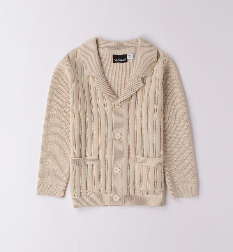 Cardigan per bambino Sarabanda da 9 mesi a 8 anni in tricot 100% cotone. Il modello presenta apertura frontale con bottoni, tasche laterali e fantasia tinta unita.