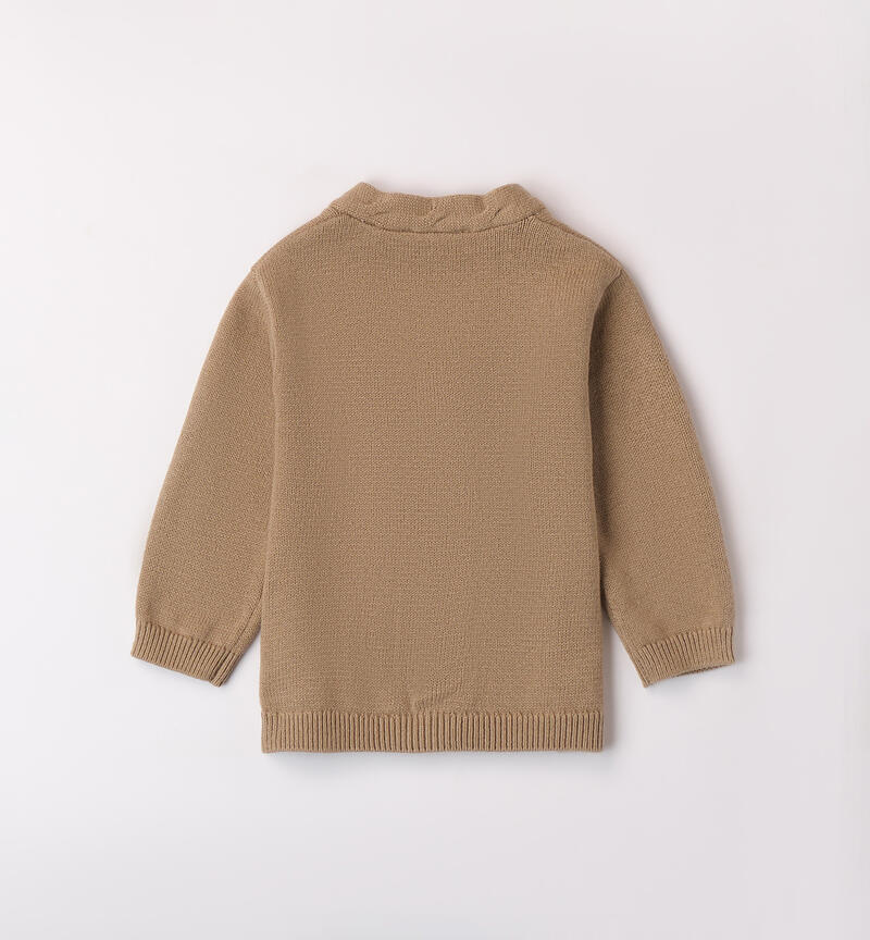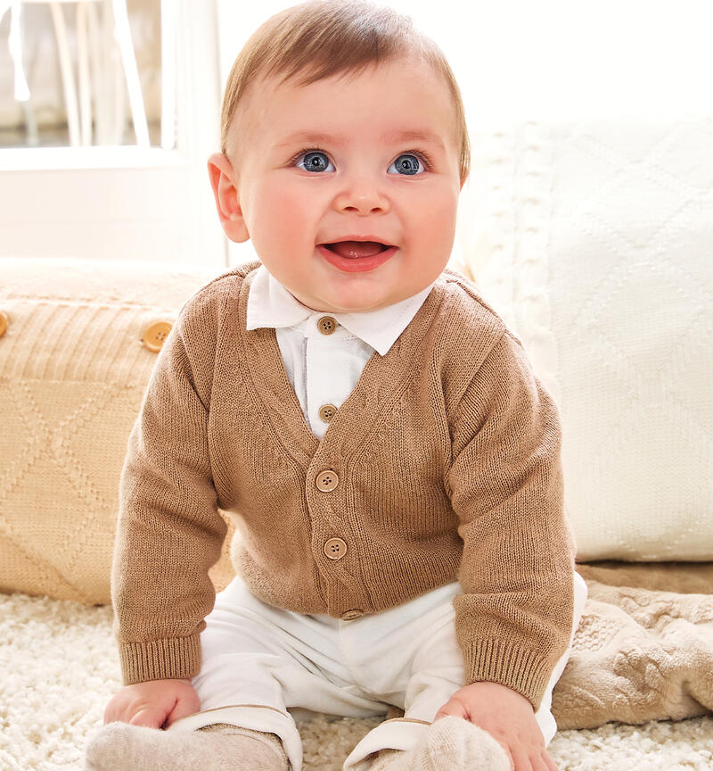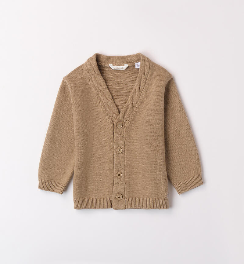 Cardigan per bimbo Minibanda 1-24 mesi realizzato in tricot lana e cotone. Il modello presenta apertura sul davanti con bottoni tono su tono e fantasia tinta unita.