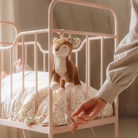 Vai e dormi bene. Questo cerbiatto addormentato ti conduce in un mondo da sogno pieno di meraviglia e immaginazione. Crea una routine della buonanotte fissa con le incantevoli melodie di questo grazioso carillon. Tira l’anello di legno e la dolce ninna nanna inizia a suonare mentre il tuo piccolo si addormenta. Un regalo meraviglioso e una splendida decorazione per la cameretta.