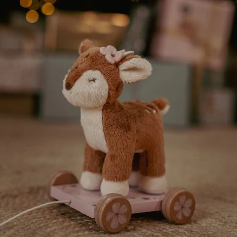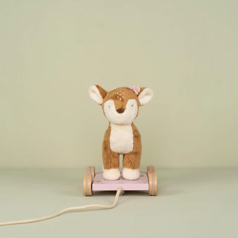 Porta con te il piccolo cervo! Tira la cordicella e parti all’avventura insieme. Il cervo ti seguirà attraverso l’incantevole giardino delle fate, dove crescono i fiori più belli e le piccole fate cantano e ballano. Il morbido e tenero cervo è su un carretto di legno rosa decorato con fiori. Con la cordicella, il tuo bambino potrà mostrargli l’intera casa e giocare allegramente. Il grazioso animaletto da trainare incoraggerà a camminare e aiuterà lo sviluppo motorio.
