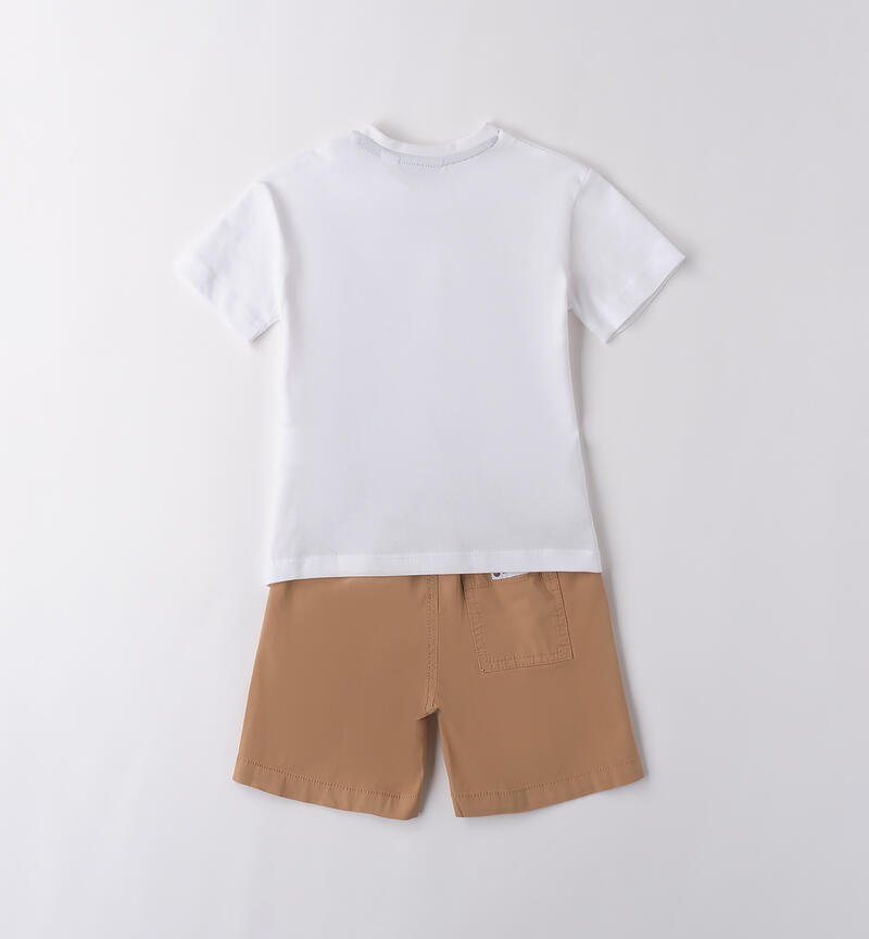 Completo per bambino Sarabanda da 9 mesi a 8 anni. La t-shirt presenta apertura sulla spalla con bottoni a pressione fino alla taglia 3 anni per agevolare il cambio e la vestizione, fantasia tinta unita con stampa ed รจ realizzata in jersey 100% cotone. Il pantaloncino ha vita elasticizzata con coulisse, tasche laterali e fantasia tinta unita. Lunghezza al ginocchio.