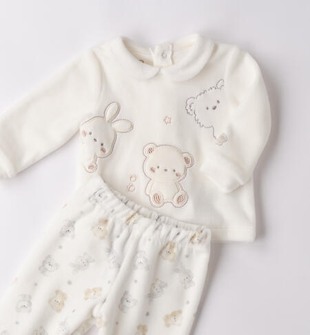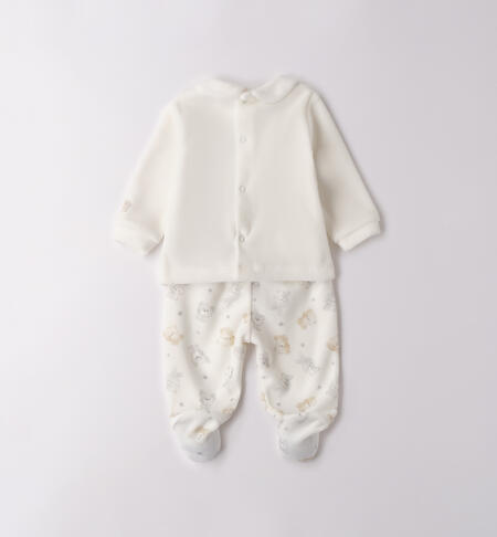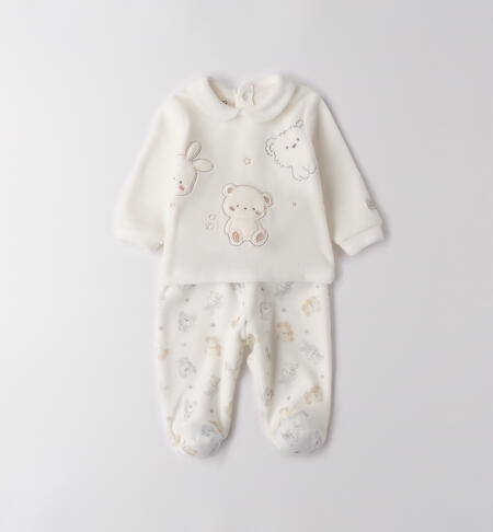 Tutina due pezzi con piede per neonati iDO in ciniglia. L’articolo presenta l’apertura sul retro con bottoni a pressione per agevolare il cambio e la vestizione.