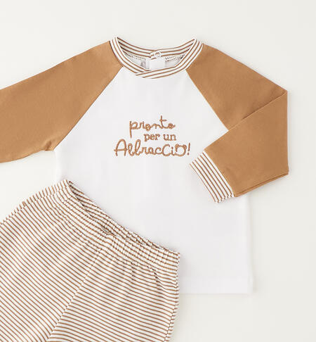 Tutina due pezzi iDO per neonato da 0 a 12 mesi realizzata in jersey stretch di cotone. Maglietta con apertura sul retro con bottoni a pressione e dolce ricamo davanti. Ghettina dalla fantasia rigata con simpatica applicazione ricamo sui piedini.