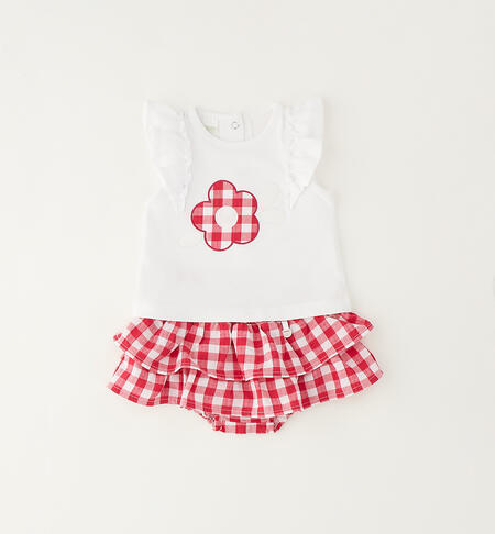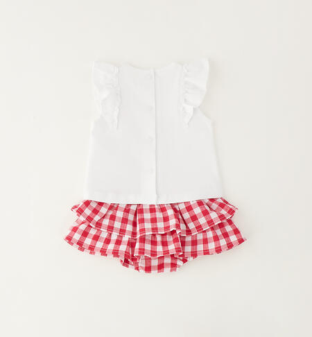 Completino estivo per bimba iDO da 1 a 24 mesi realizzato in cotone. T-shirt in jersey stretch arricchita da ruches e applicazione ricamo. Apertura sul retro con bottoni a pressione. Shorts effetto gonna in tessuto vichy a quadretti.