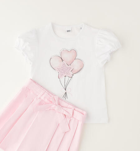 Completo grazioso per bambina iDO realizzato in cotone stretch. T-shirt con stampa cuori, ricamo stella e strass. Manica corta con elastico sul fondo. Gonna pantalone in satin con apertura laterale tramite zip invisibile. Fusciacca in vita. Misura vita regolabile con elastico asolato in vita