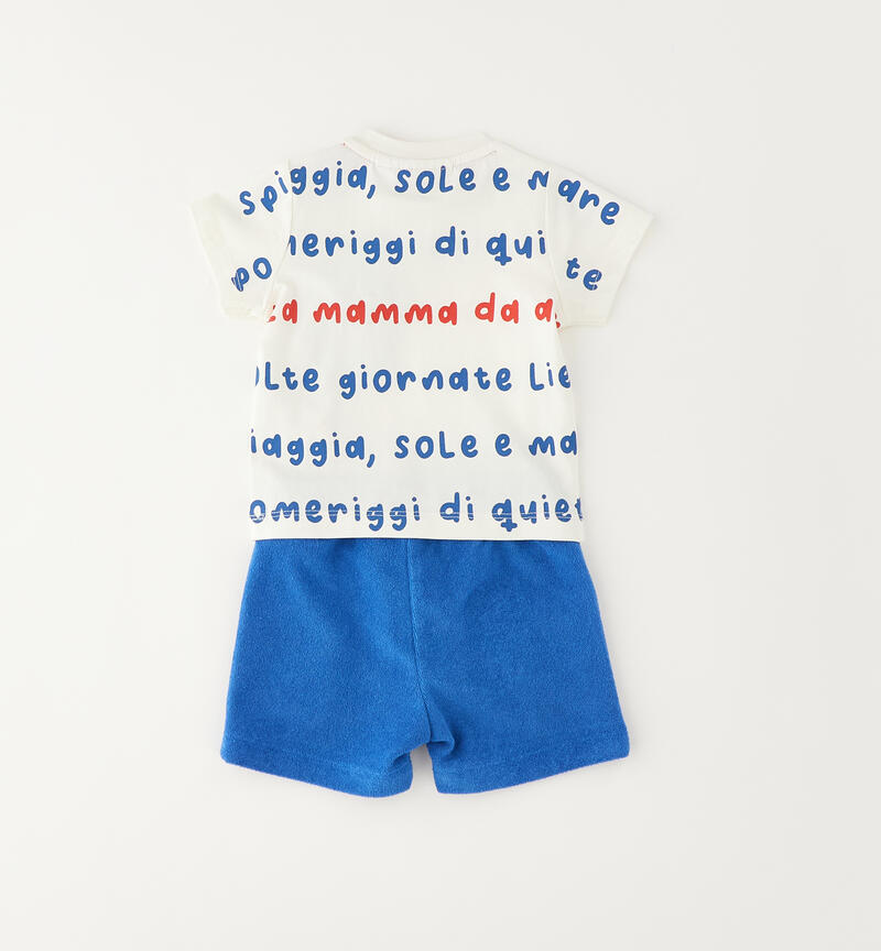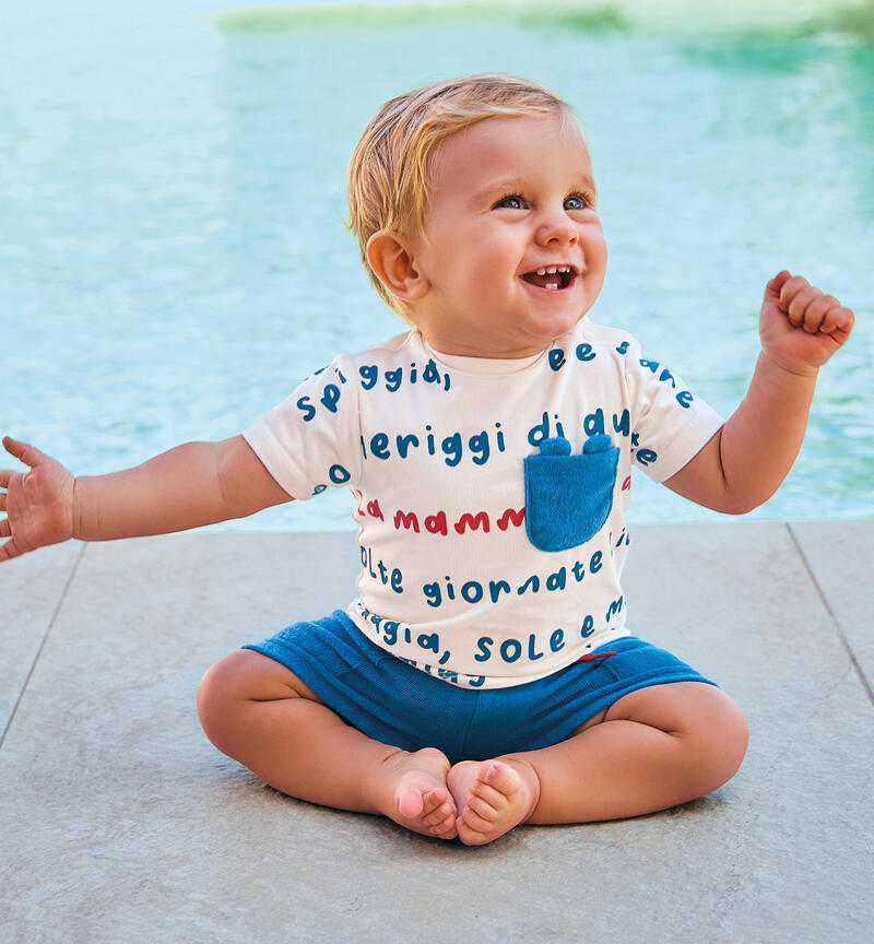 Completino estivo per neonato Minibanda realizzato in cotone. T-shirt realizzata in jersey stretch con stampa all over, apertura sulla spalla con bottoni a pressione e taschino in abbinamento al pantaloncino. Shorts in spugna, con tasche ed elastico in vita e coulisse.