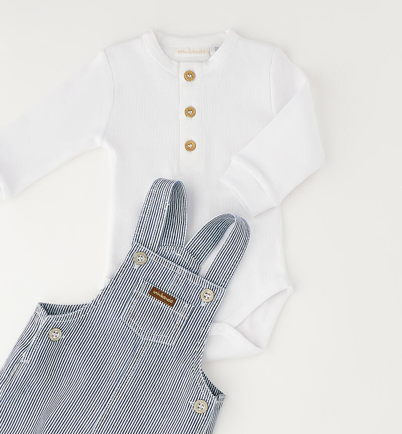 Completo per neonato Minibanda composto da body e salopette. Body in costina con apertura nell’interno gamba e bottoni davanti. Salopette in twill, fantasia rigata, tasca davanti