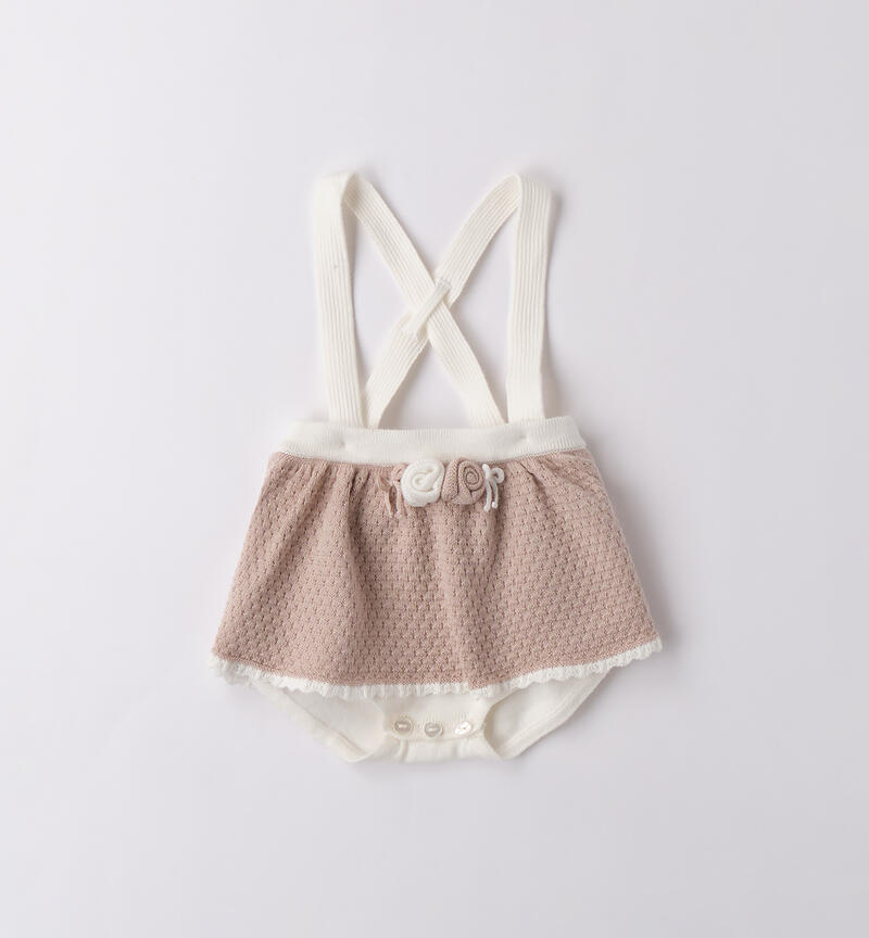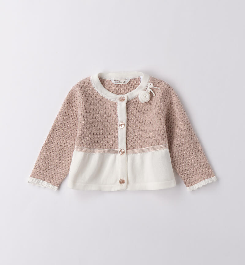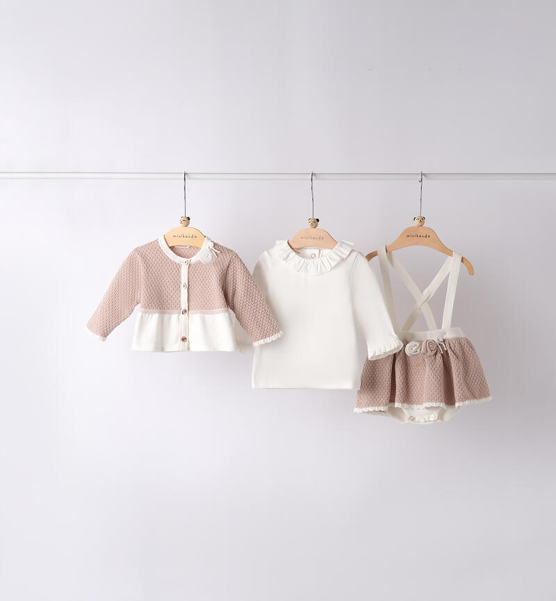 Completo neonata Minibanda 1-24 mesi realizzato in cotone. Il modello si compone di: cardigan, maglietta e culotte con bretelle. Il cardigan รจ in tricot e presenta apertura con bottoni sul davanti e fantasia bicolor. La maglietta รจ in jersey stretch di cotone e ha apertura sul retro con bottoni a pressione per agevolare il cambio e la vestizione. La culotte รจ in tricot con vita elasticizzata e con bretelle. Fiori in arricchimento