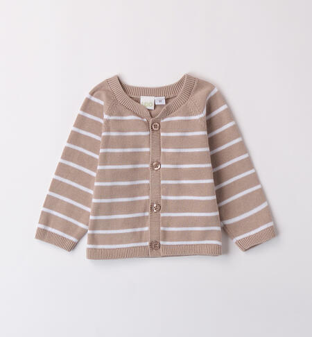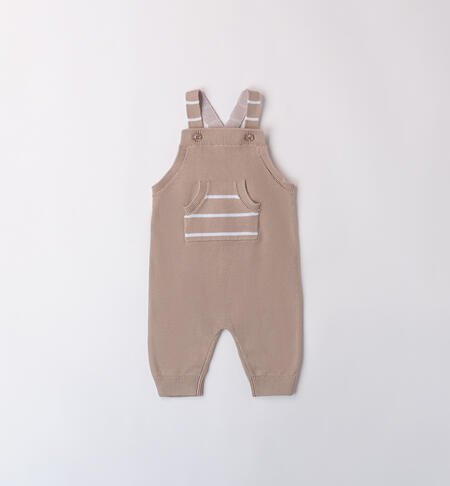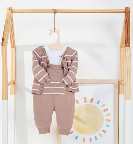 Completo 3 pezzi per neonato iDO. Il modello è composto da: maglietta, giacchina e salopette. La maglietta è in jersey stretch di cotone con apertura dietro tramite bottoni snap. La salopette in fantasia tinta unita con dettagli a righe in tricot 100% cotone, cardigan a righe, tricot 100% cotone.