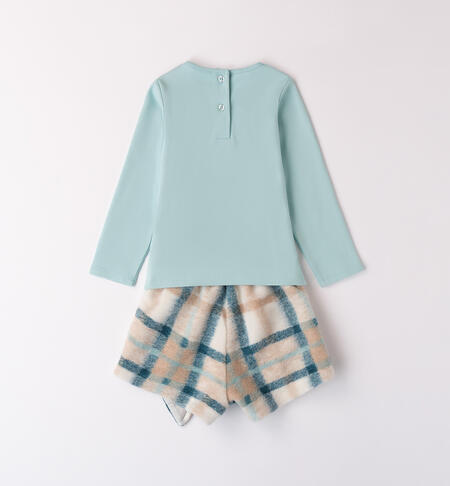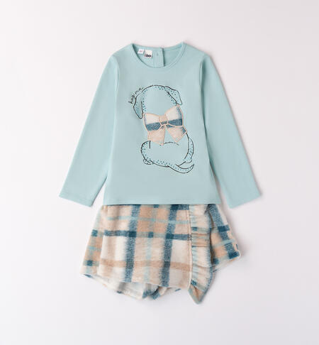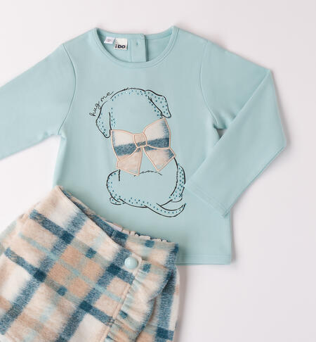 Completo per bambina iDO 9 mesi – 8 anni composto da maglietta e shorts. La maglietta è realizzata in interlock 100% cotone presenta apertura sul retro con bottoni e davanti è arricchita da stampa cane con strass e applicazione ricamo fiocco. Lo shorts è in morbido tessuto a quadri, foderato in cotone. Apertura con bottoni, ruches in applicazione.