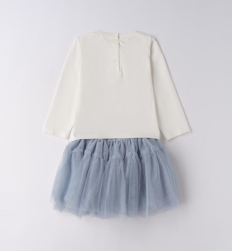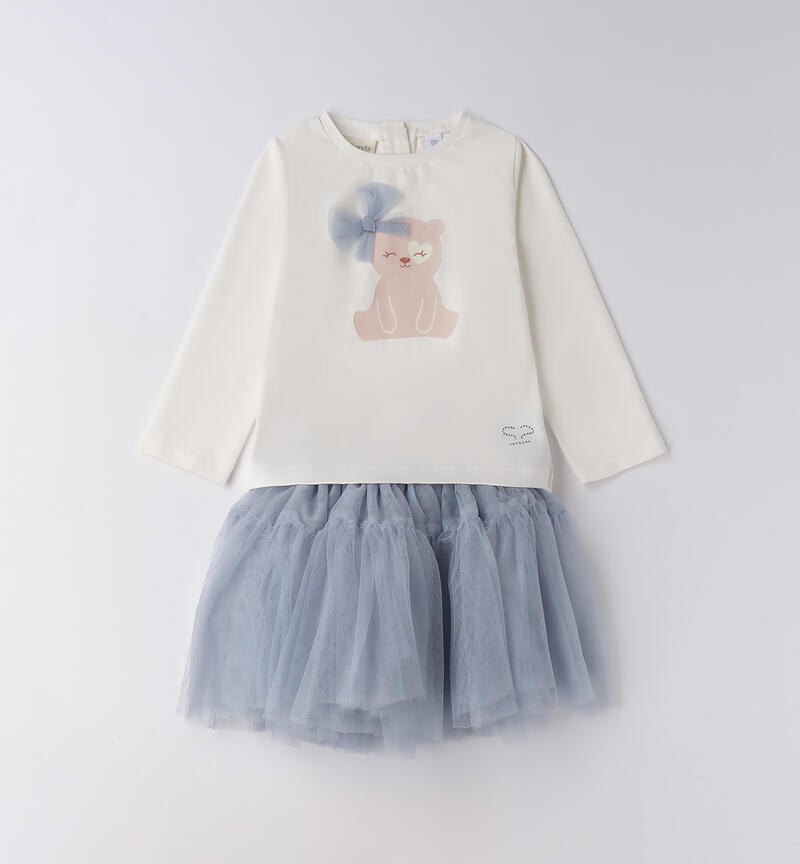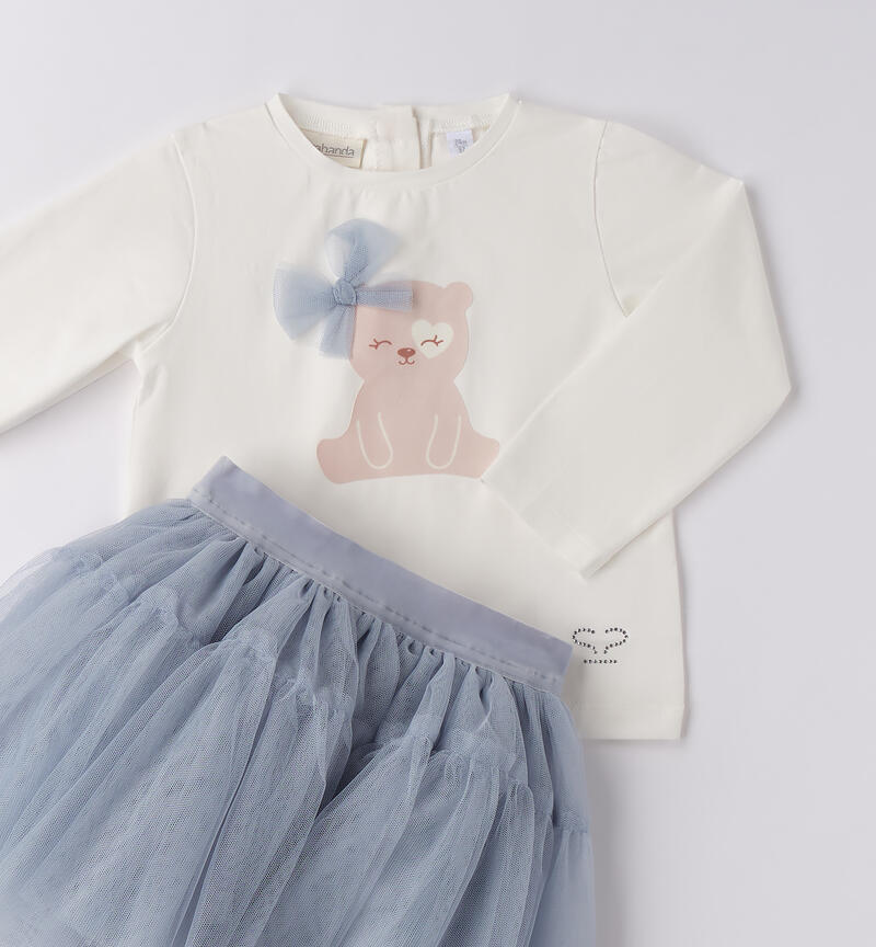 Completo per bambina Sarabanda. Il modello è composto da maglietta e gonna. La maglietta è in jerset stretch manopesca con applicazione e fiocco in tulle. Gonna in tulle con fodera in satin. Lunghezza al ginocchio