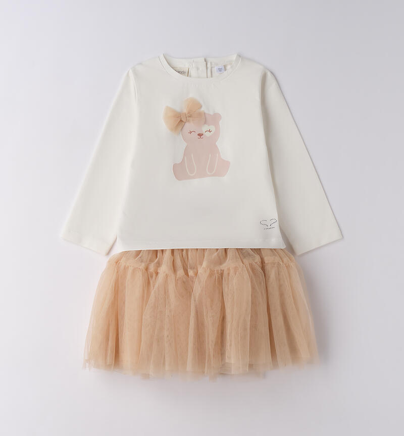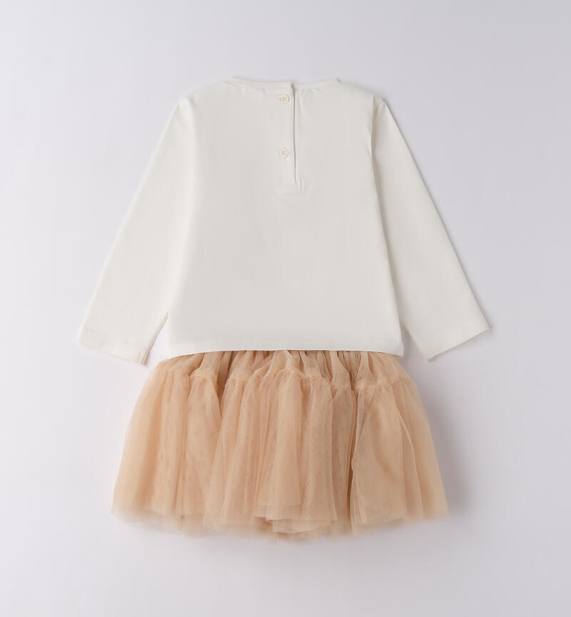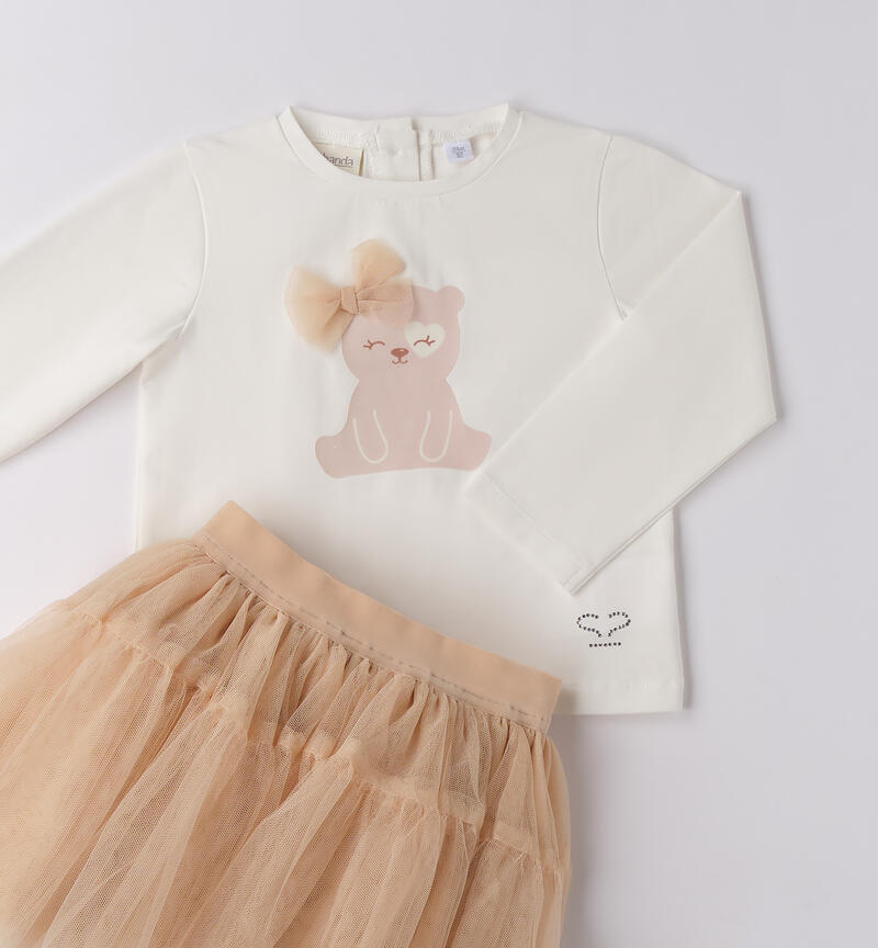Completo per bambina Sarabanda. Il modello è composto da maglietta e gonna. La maglietta è in jerset stretch manopesca con applicazione e fiocco in tulle. Gonna in tulle con fodera in satin. Lunghezza al ginocchio