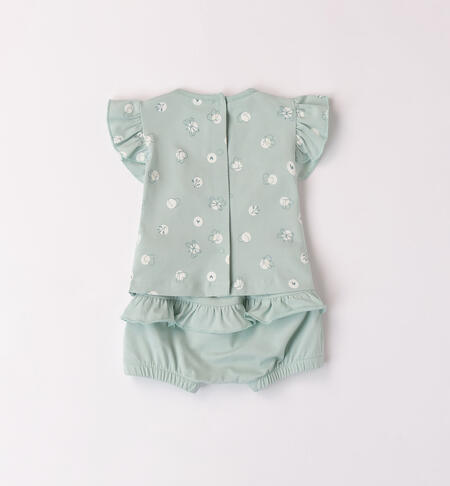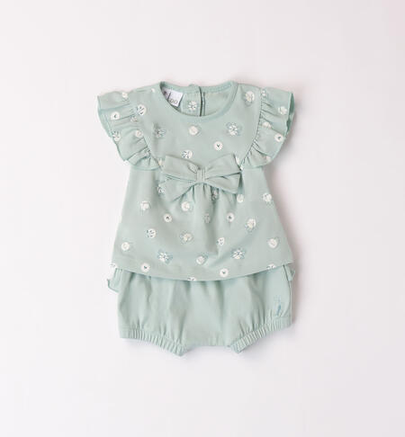 Completo due pezzi iDO per bimba realizzato in jersey stretch di cotone. La maglietta è realizzata in fantasia allover con ruches nel giromanica e applicazione frontale con fiocco. Lo short ha vita elsticizzata con ruches e ricamo di coniglietti.