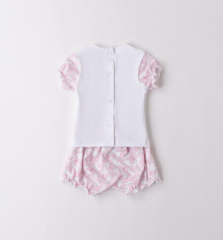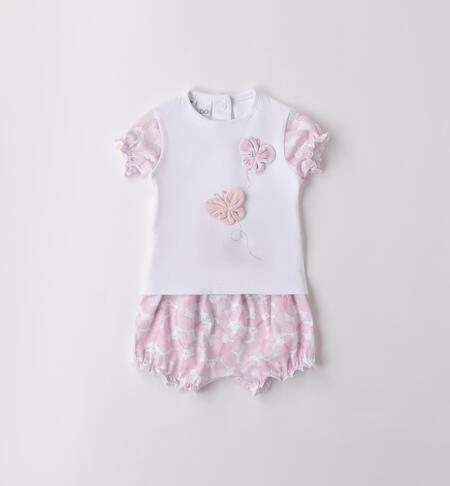 Completo manica corta per neonata iDO 1-24 mesi realizzato in jersey elasticizzato di cotone. La maglietta ha l’apertura dietro con bottoni a pressione e applicazione farfalle davanti.