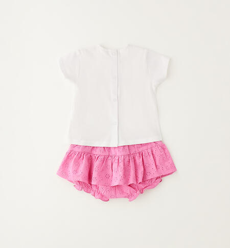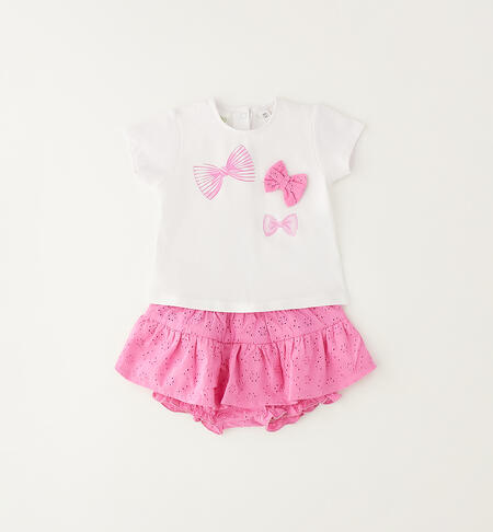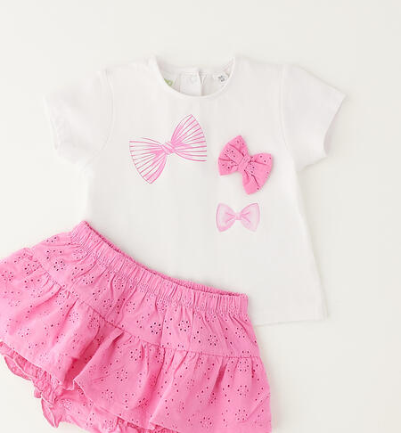 Grazioso completo per bimba iDO da 1 a 24 mesi realizzato in cotone. La t-shirt è in jersey stretch con apertura dietro tramite bottoni a pressione. Davanti è arricchita da stampa fiocchi e fiocco in applicazione in abbinamento allo shorts. Shorts effetto gonna realizzato in tessuto sangallo.