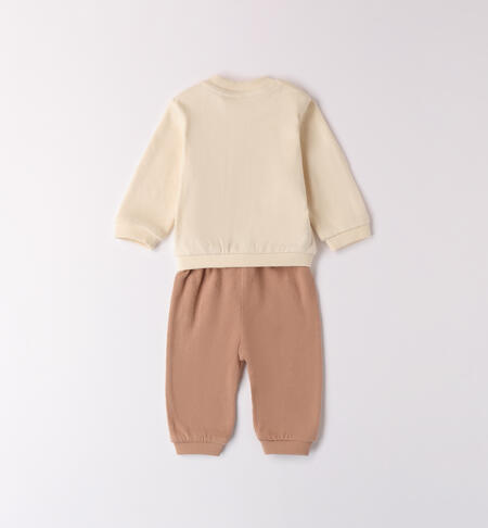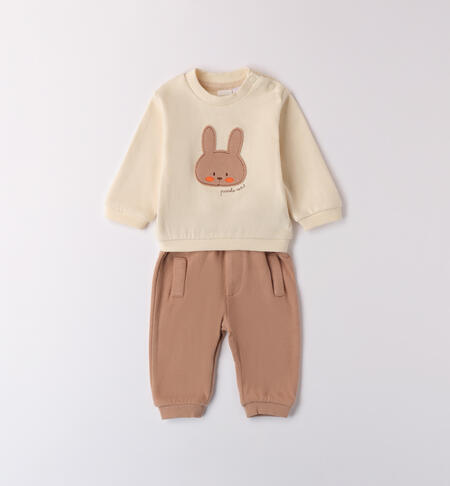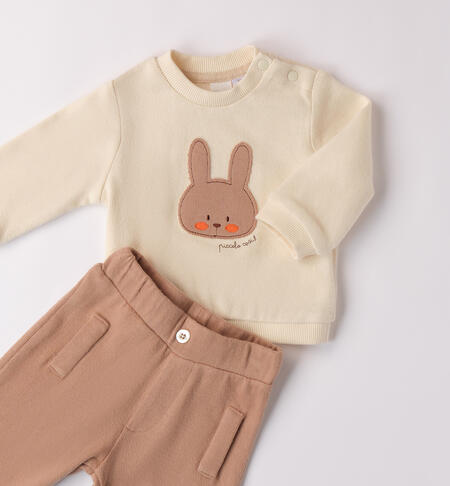 Completo due pezzi per neonato iDO 1-24 mesi in felpa effetto tricot, cotone stretch. La felpa presenta apertura sulla spalla con bottoni a pressione e fantasia tinta unita con coniglietto davanti. Il pantalone ha vita elsticizzata, tasche laterali e polsini sul fondo.