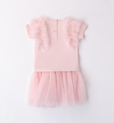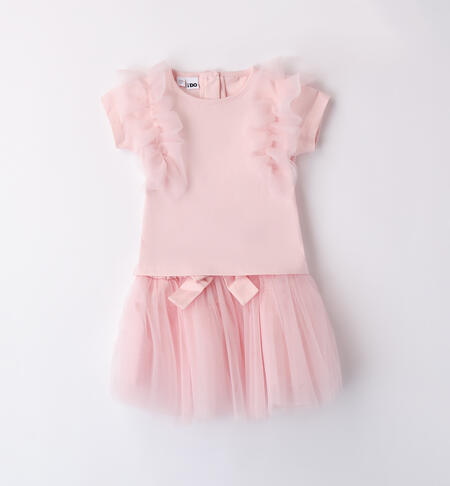 Completo elegante bambina da 9 mesi a 8 anni iDO composto da t-shirt e gonna. La t-shirt è in jersey stertch di cotone e ha apertura sul retro con bottoni ed inserti in tulle sulle maniche. La gonna è in tulle con fiocco in vita e fodera interna. Lunghezza sopra al ginocchio.