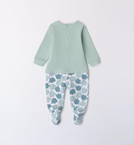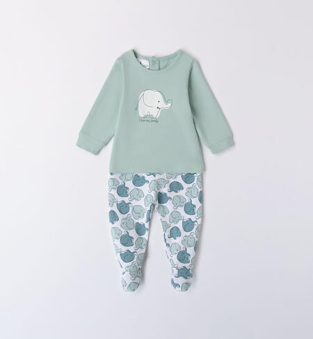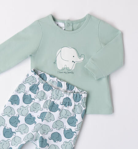 Completo clinica neonato iDO realizzata in jersey stretch di cotone. Il modello presenta aperura sul retro con bottoni a pressione per agevolare il cambio e la vestizione. La maglietta a manica lunga รจ realizzata in fantasia tinta unita e stampa di elefante. La ghettina, invece, รจ in fantasia allover di elefantini