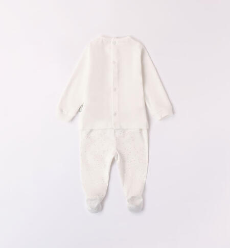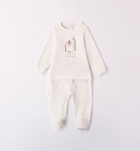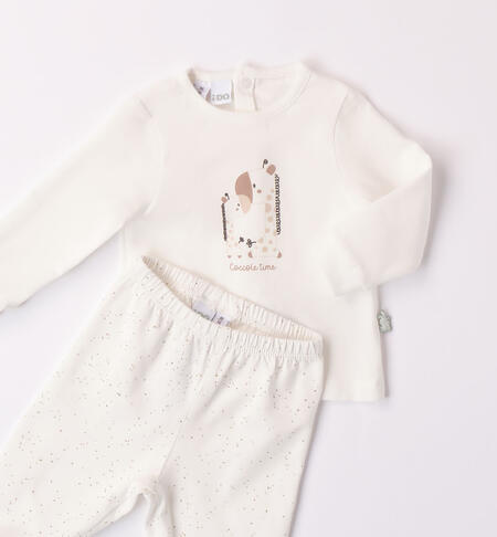Tutina neonati due pezzi iDO realizzata in jersey stretch di cotone. La maglietta ha stampa animaletti e apertura sulla schiena con bottoni snap per agevolare la vestibilitร . La ghettina ha fantasia all over. Completo clinica, modello unisex.