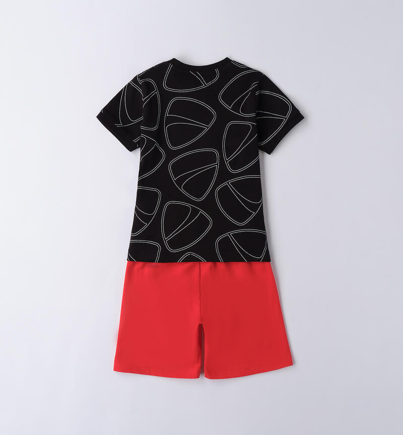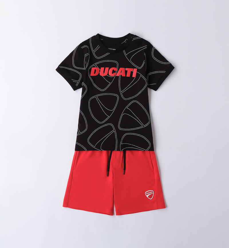 Completo estivo Ducati per bambino da 9 mesi a 7 anni realizzato in jersey 100% cotone. T-shirt con stampa Ducati e logo all over. Apertura sulla spalla con bottoni fino alla taglia 3 anni per agevolare il cambio e la vestizione. Pantalone corto con elastico in vita e coulisse. Lunghezza al ginocchio.