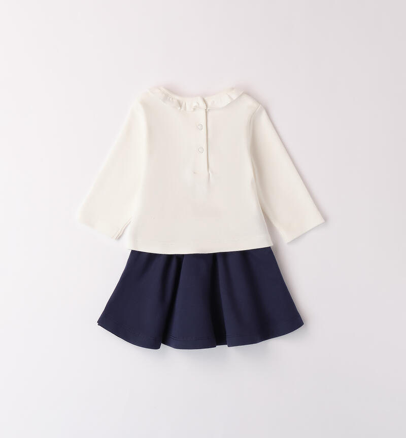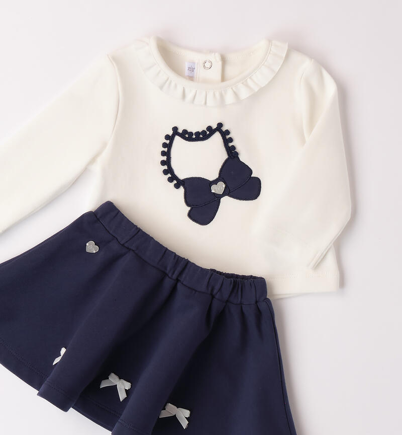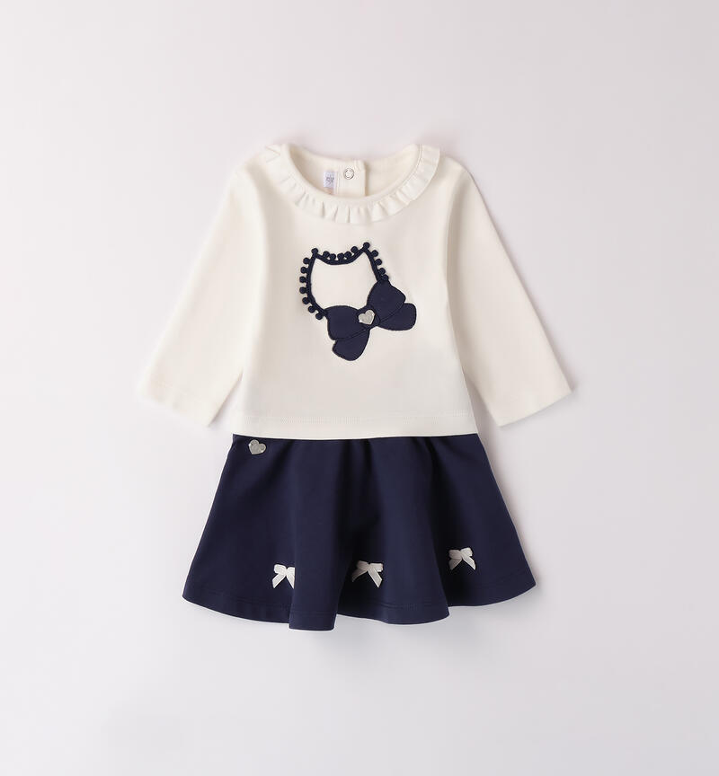 Completo due pezzi per neonata Minibanda in cotone. La maglia presenta apertura sulla schiena con bottoni a pressione per agevolare il cambio e la vestizione, colletto con ruches e ricamo sul davanti arricchito da passamaneria. La maglietta รจ realizzata in interlock 100% cotone. La gonna, in felpa invernale, ha lunghezza sopra al ginocchio, fantasia tinta unita e fiocchi in applicazione
