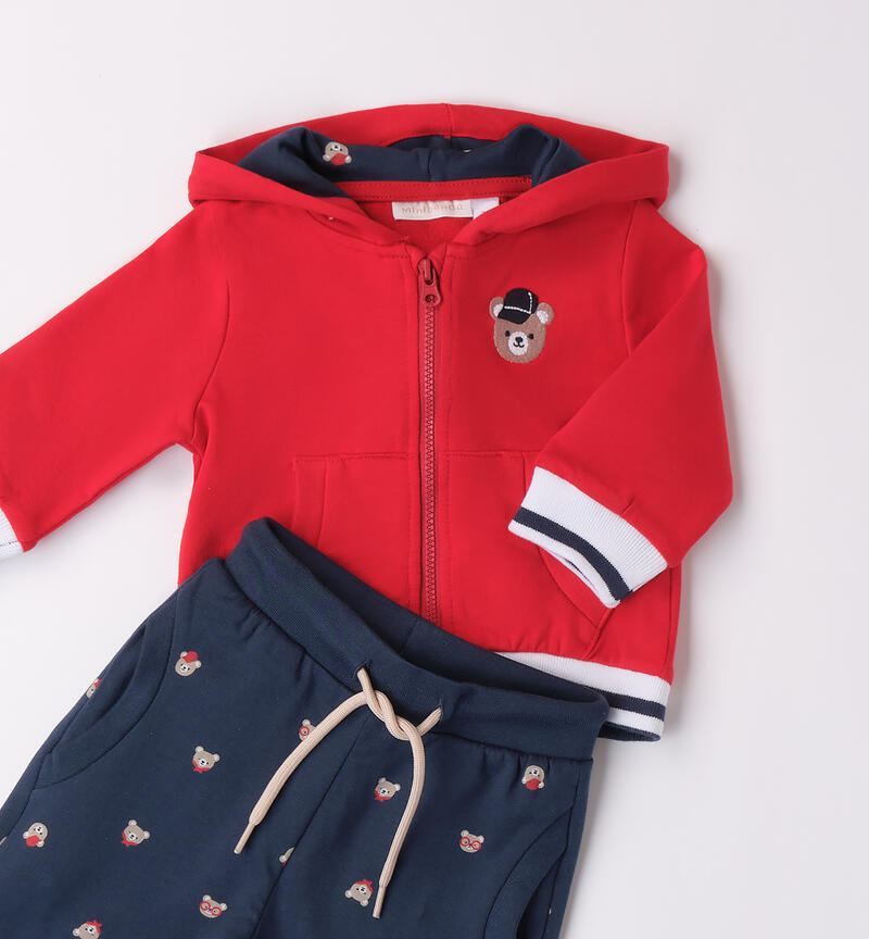 Completo bimbo due pezzi Minibanda 1-24 mesi realizzato in felpa 100% cotone. Il modello presenta apertura frontale con zip. La felpa รจ realizzata in tinta unita con applicazione frontale e tasche a marsupio. Modello con cappuccio. Il pantalone ha la vita elasticizzata con coulisse, i polsini sul fondo gamba, tasche laterali e fantasia allover.