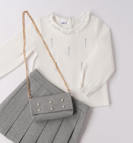 Completo per bambina iDO composto da maglietta e gonna. La maglietta è in jersey stretch di cotone manopesca con aperta dietro tramite bottoni. Il modello è arricchito da strass e colletto con ruches. Gonna in punto milano, plissetata, lunghezza sopra al ginocchio. In abbinamento borsa con tracolla staccabile arricchita da perle e strass. Altezza 9 cm, lunghezza 16 cm circa.