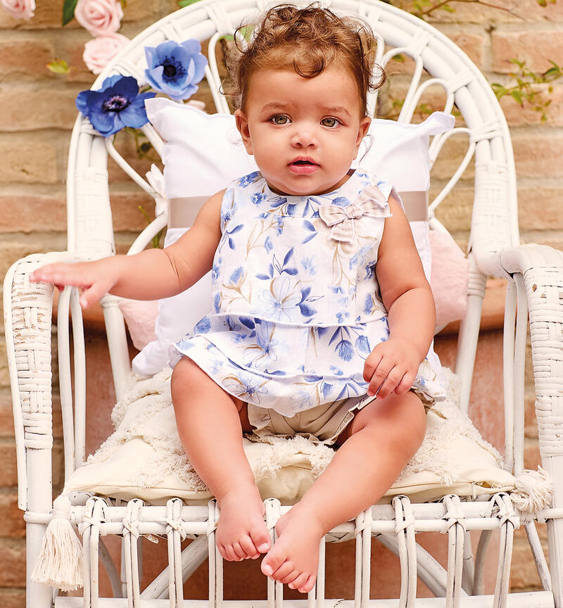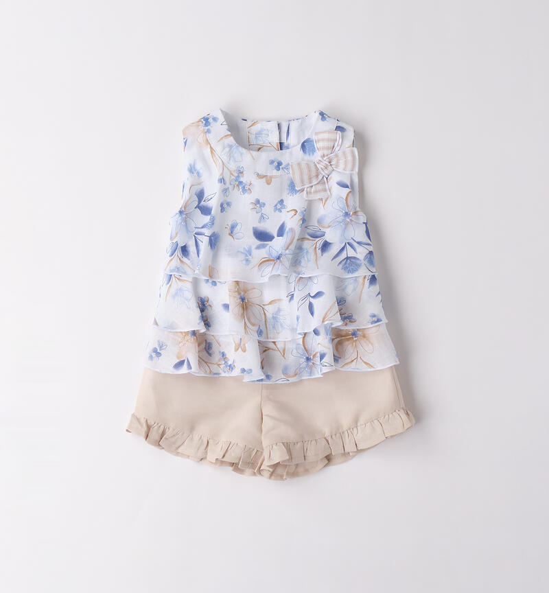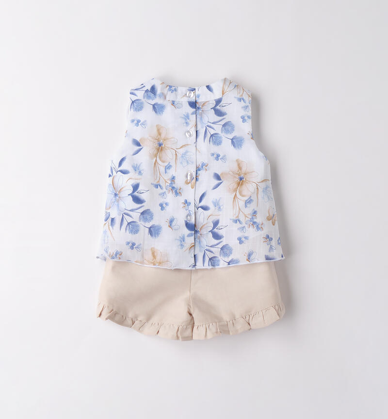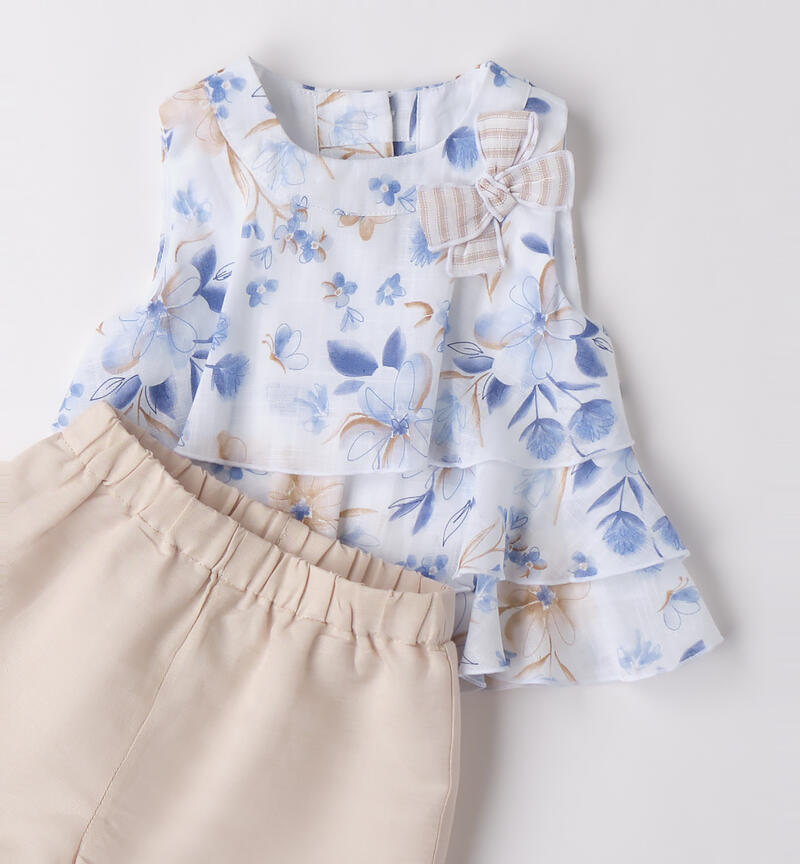 Completo Minibanda 1-24 mesi. La camicia è a balze dalla fantasia floreale con fodera in cotone. Apertura sul retro con zip invisibile, fiocco in applicazione. Gli shorts sono in lino e cotone e hanno vita elasticizzata con ruches sul fondo e fantasia tinta unita.