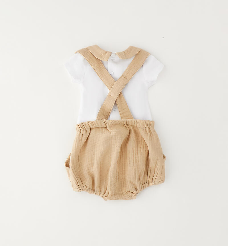 Completo manica corta per neonato Minibanda composto da body in n jersey stretch e salopette in tela di cotone. Bretelle regolabili.