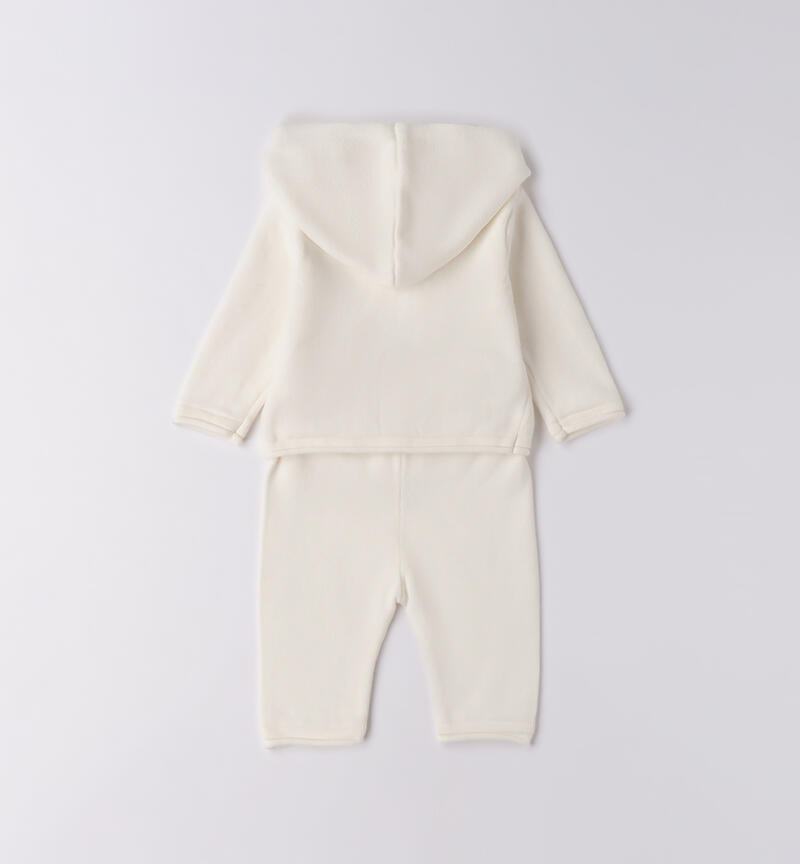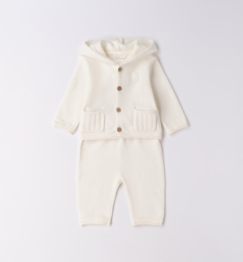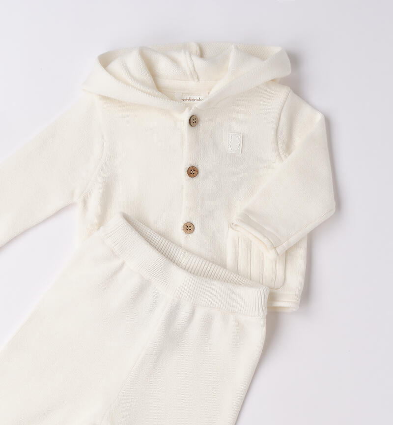 Completo bimbo due pezzi Minibanda 0-18 mesi realizzato in tricot. Il modello è composto da maglioncino con cappuccio, tasche e apertura con bottoni.