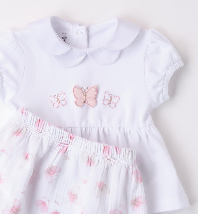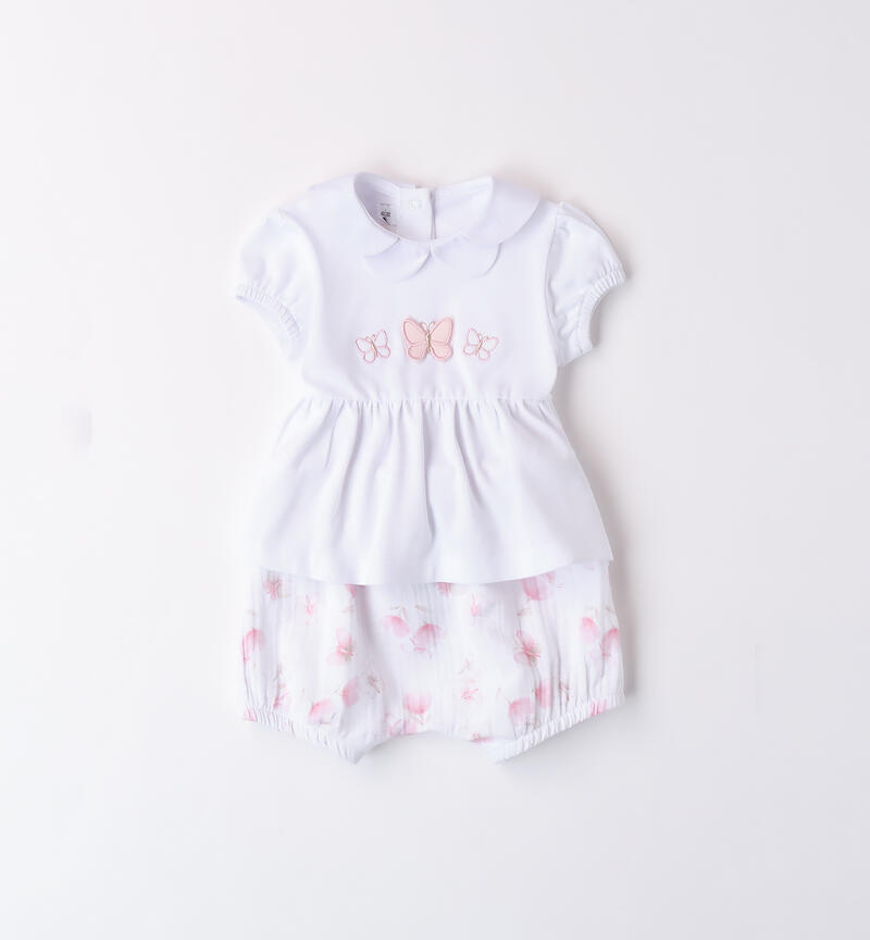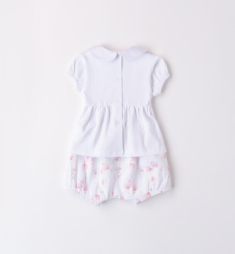 Completo Minibanda 1-24 mesi realizzato in jersey stretch di cotone e tessuto muslin. La T-Shirt presenta apertura sul retro con bottoni a pressione per agevolare il cambio e la vestizione, fantasia tinta unita e ruches a contrasto sul fondo. I pantaloni hanno vita elasticizzata e fantasia allover.