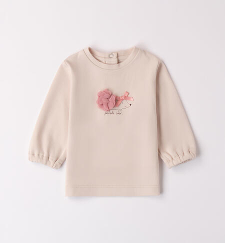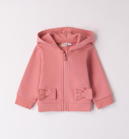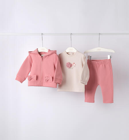 Completo per bimba neonata iDO 3 pezzi, realizzato in cotone. Il completo è composto da: felpa, maglietta e pantalone. La felpa, pesantezza invernale è in cotone stretch e presenta apertura frontale con zip e fiocchi in applicazione; la maglietta è in interlock 100% cotone tinta unita con applicazione frontale ed il pantalone, con vita elasticizzata, è in tessuto felpato invernale in cotone stretch. La fullzip ha il cappuccio.