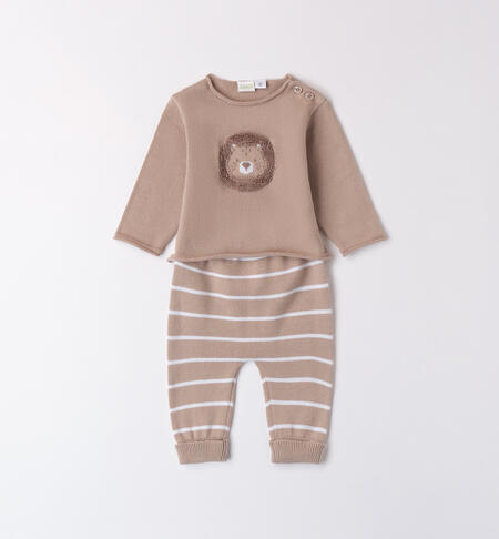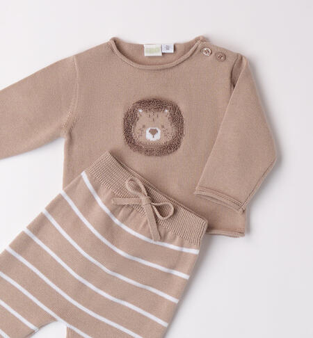Completo 2 pezzi per neonato iDO in 100% tricot di cotone. L’articolo presenta apertura sulla spalla con bottoni ed è in fantasia tinta unita con ricamo davanti nella parte superiore, mentre i pantaloni, con vita elasticizzata sono in fantasia a righe.