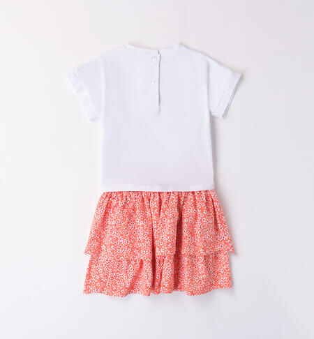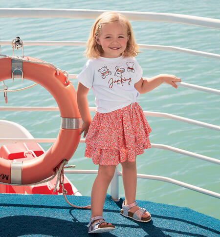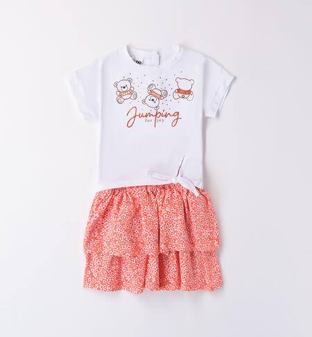 Grazioso completo iDO per bambina composto da t-shirt e gonna realizzato in jersey stretch di cotone. La maglietta ha stampa orsacchiotti con applicazione di strass e dettagli lurex. Nodo davanti. La gonna ha fantasia a fiorellini. Lunghezza sopra al ginocchio.