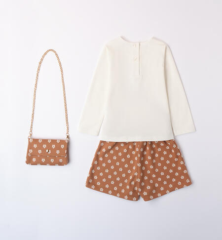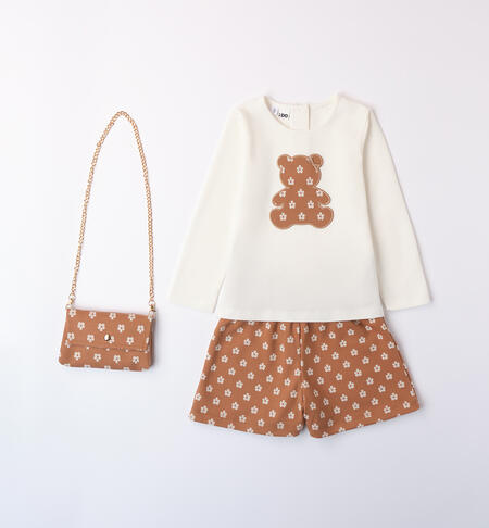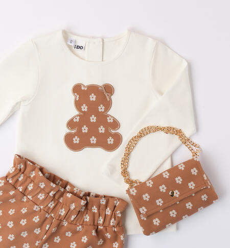 Completo per bambina iDO 3 – 8 anni. Il modello è composto da maglietta e shorts. La maglietta presenta apertura sul retro con bottoni, applicazione ricamo orsetto davanti ed è realizzata in jersey stretch mano pesca di cotone. Lo shorts, in tessuto jacquard, è in fantasia a fiori.