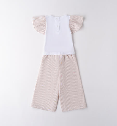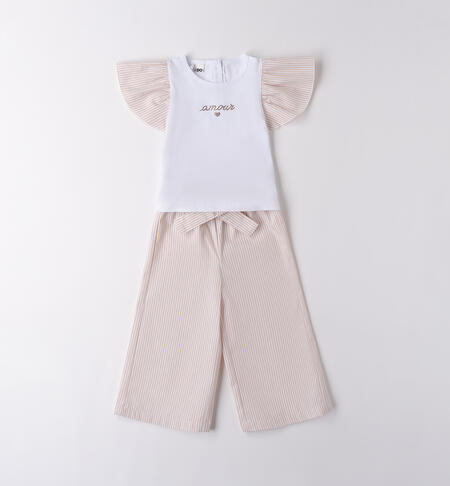 Completo per bambina iDO da 9 mesi a 8 anni. La t-shirt è in jersey 100% cotone e presenta apertura sul retro con bottoni, maniche volant e con strass in applicazione. Il pantalone è in canvas, modello ampio in fantasia a righe.